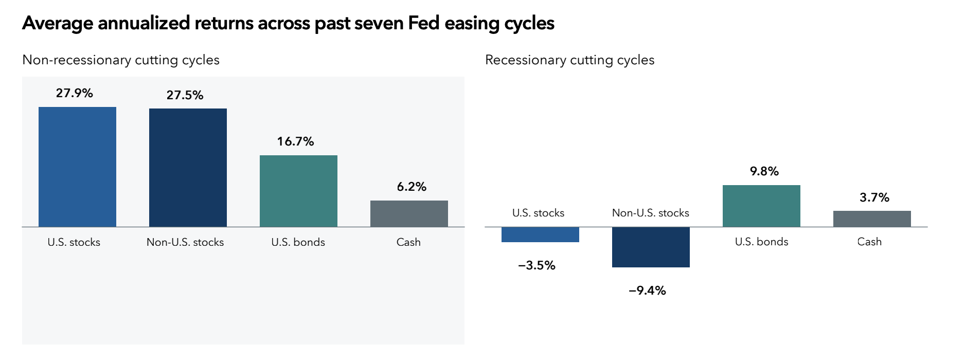 • Will the market continue to climb into next year? Certainly we do not know. However, the general economic indicators are still positive or neutral. Most likely the market gains will come from a broader cross-section of industries and sectors. As this chart from Capital Group highlights, the market has performed well in the non-recessionary rate cutting periods (average ~28% return for S&P and ~17% for US Bonds for the three such periods since 1984). But again, given the high valuation of the growth companies, adding more value/defensive companies is probably sound. Largely because of the very high valuations, we should not be shocked if there is some market pullback next year.