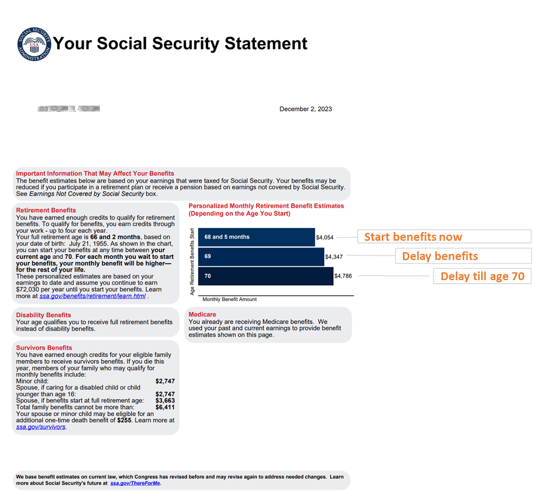 The blue bar chart shows the benefit you’d get if you started collecting retirement benefits immediately. The bottom bar shows your benefit amount if you delay taking benefits as long as possible by waiting until age 70. The middle bar illustrates waiting to take benefits in between now and age 70.