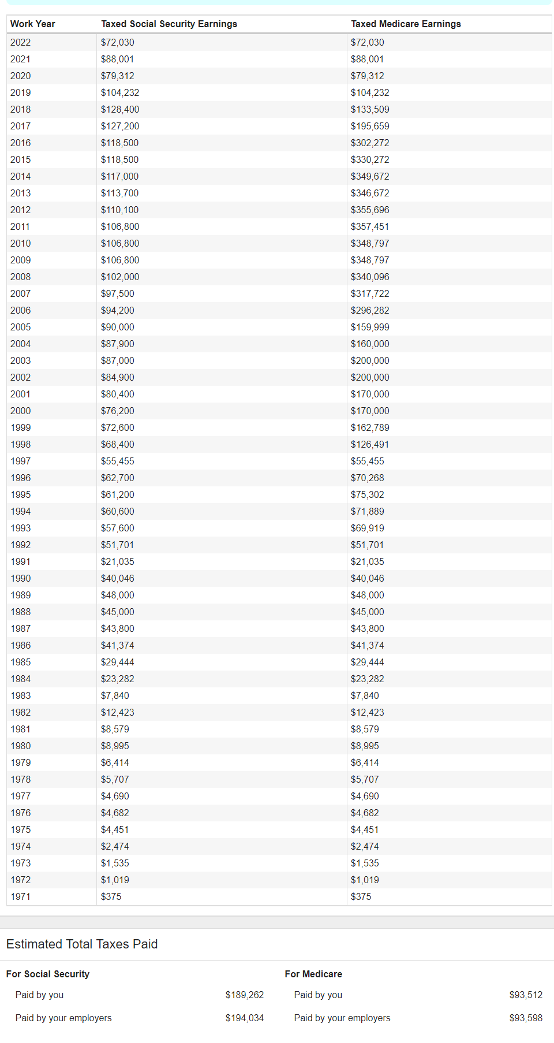 Page 2 of your social security statement includes a table summarizing your earnings history. For a full earnings history report, scroll down on your personal social security account home page.